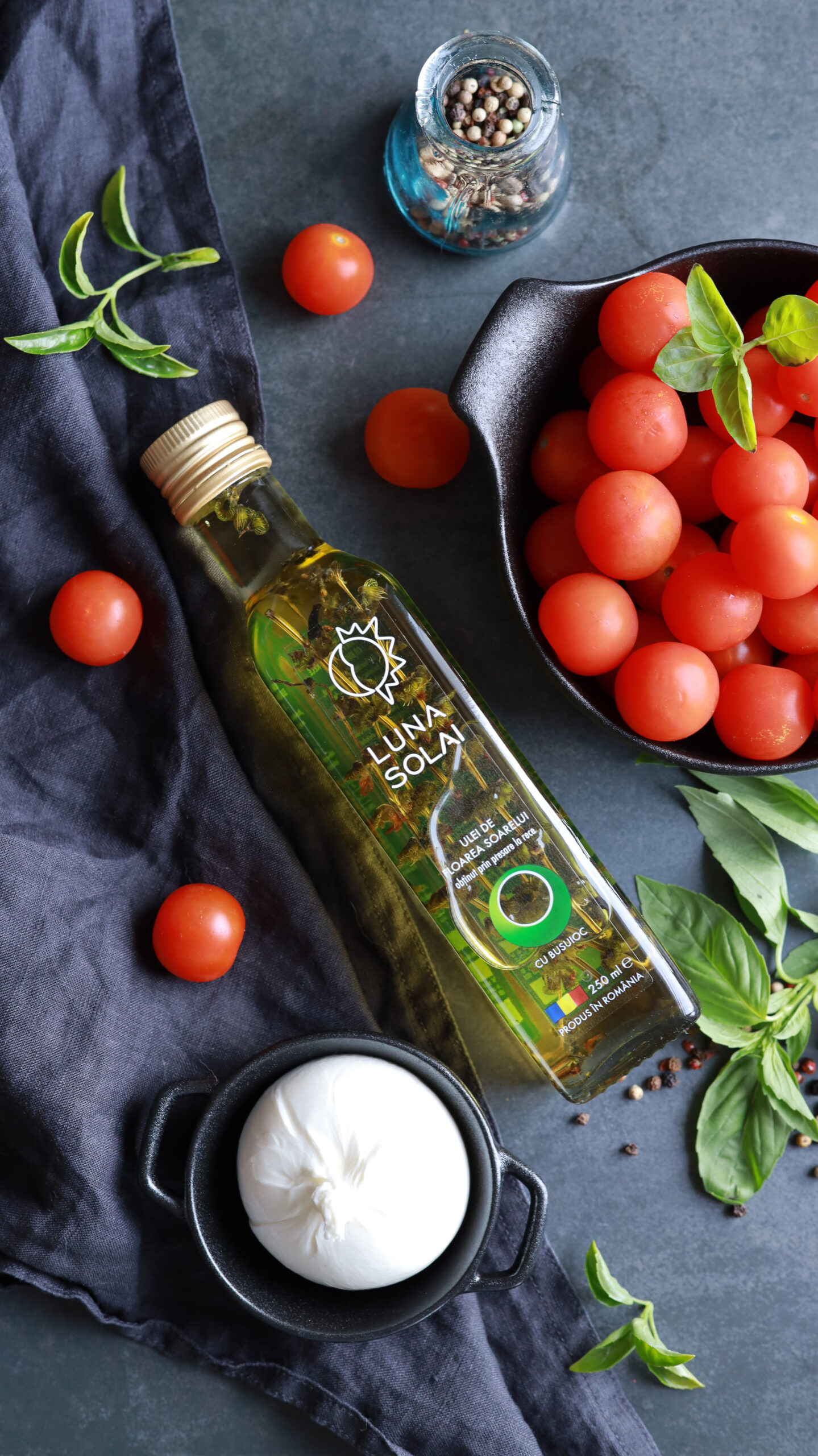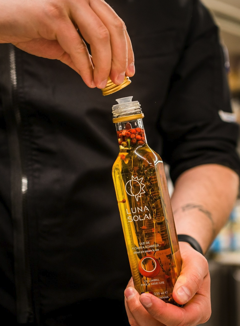 Un produs natural, inspirat din bucătăria tradiţională românească, extras fără procedee termice din seminţele de floarea soarelui, aromatizat cu cimbru uscat.